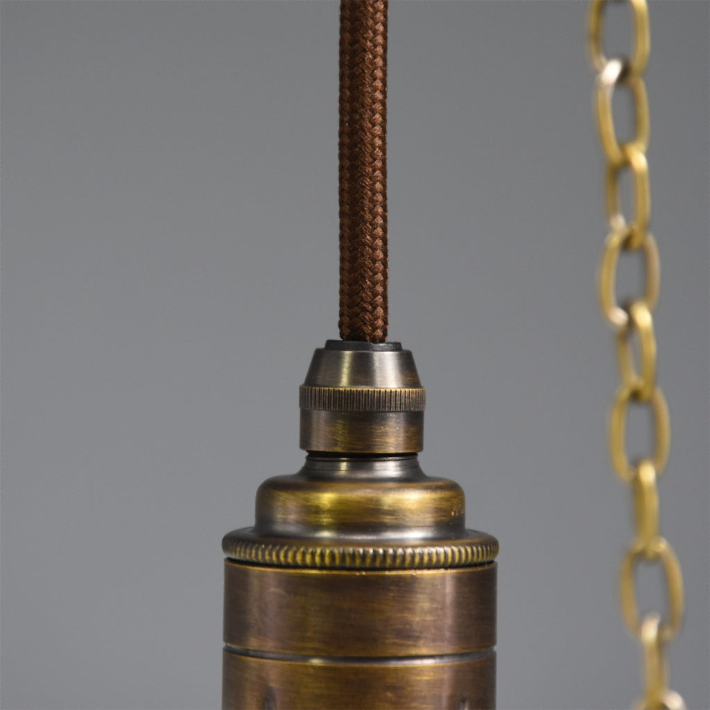 I have carefully restored this salvaged light to its former glory and fitted it with new brushed brass components; chains, glass bowl hooks, 3-hook ceiling fitting and lamp holder. It has a new wooden pattress and is fitted with dark brown fabric flex. The ES (E27) lampholder has been PAT tested for safety.