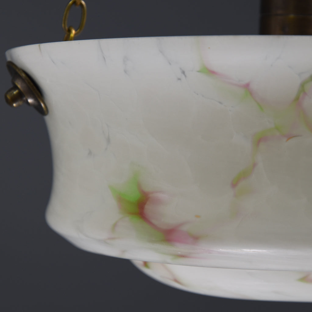1930s-1950s vintage glass flycatcher ceiling light shade with marbling in green and deep red on semi-opaque opal glass.
