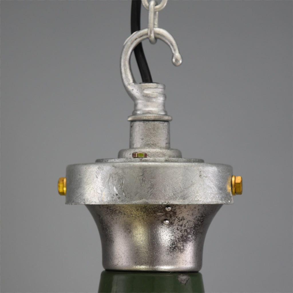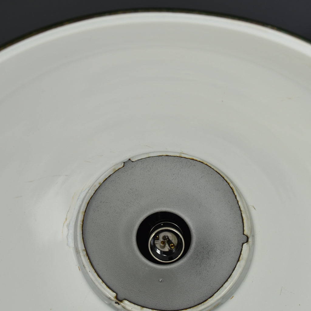 Vitreous enamelled green pendant light in original reclaimed condition, showing normal signs of wear and tear.