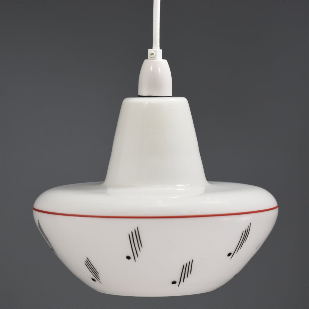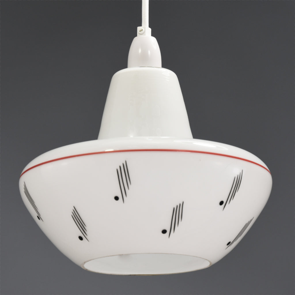 Pair of 1950s-1960s Mid-Century Modern white glasss ceiling lights with red line and black motif complete with all fittings, ceiling rose, lamp holder, cable and bulbs