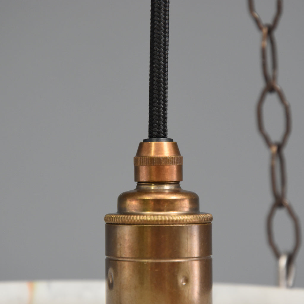 I have carefully restored this salvaged light to its former glory and fitted it with new antique brass components; chains, glass bowl hooks, 3-hook ceiling fitting and lamp holder. It has a new wooden pattress and is fitted with black fabric flex. The ES (E27) lampholder has been PAT tested for safety.