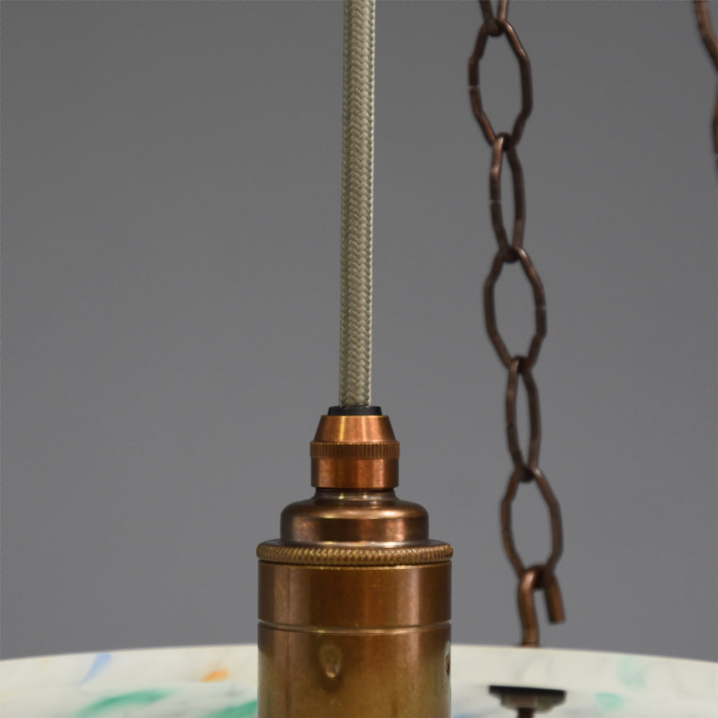 1940s-1950s flycatcher ceiling light with ribbed sides and multi-colour flecks and original decorative bowl hooks