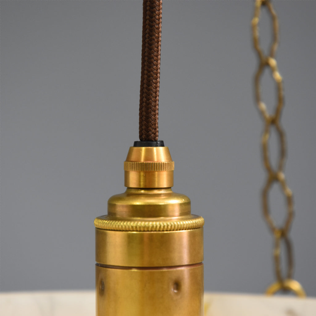 I have carefully restored this salvaged light to its former glory and fitted it with new aged brass components; chains, glass bowl hooks, 3-hook ceiling fitting and lamp holder. It has a new large wooden pattress and is fitted with dark brown fabric flex. The ES (E27) lampholder has been PAT tested for safety.