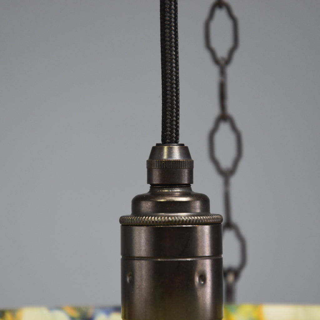 I have carefully restored this salvaged light to its former glory and fitted it with new bronze components; chains, glass bowl hooks, 3-hook ceiling fitting and lamp holder. It has a new deep stacked wooden pattress and is fitted with black fabric flex. The ES (E27) lampholder has been PAT tested for safety.
