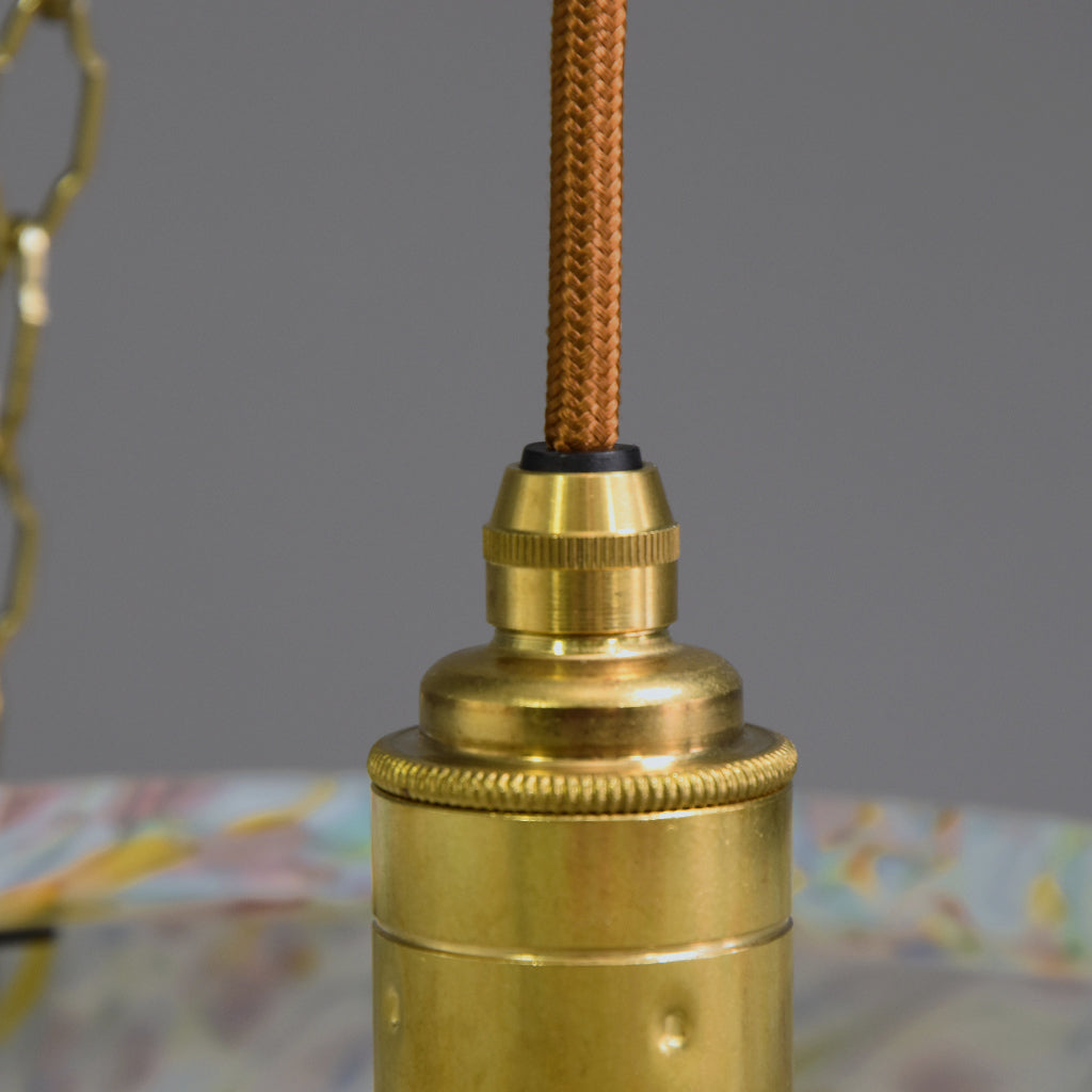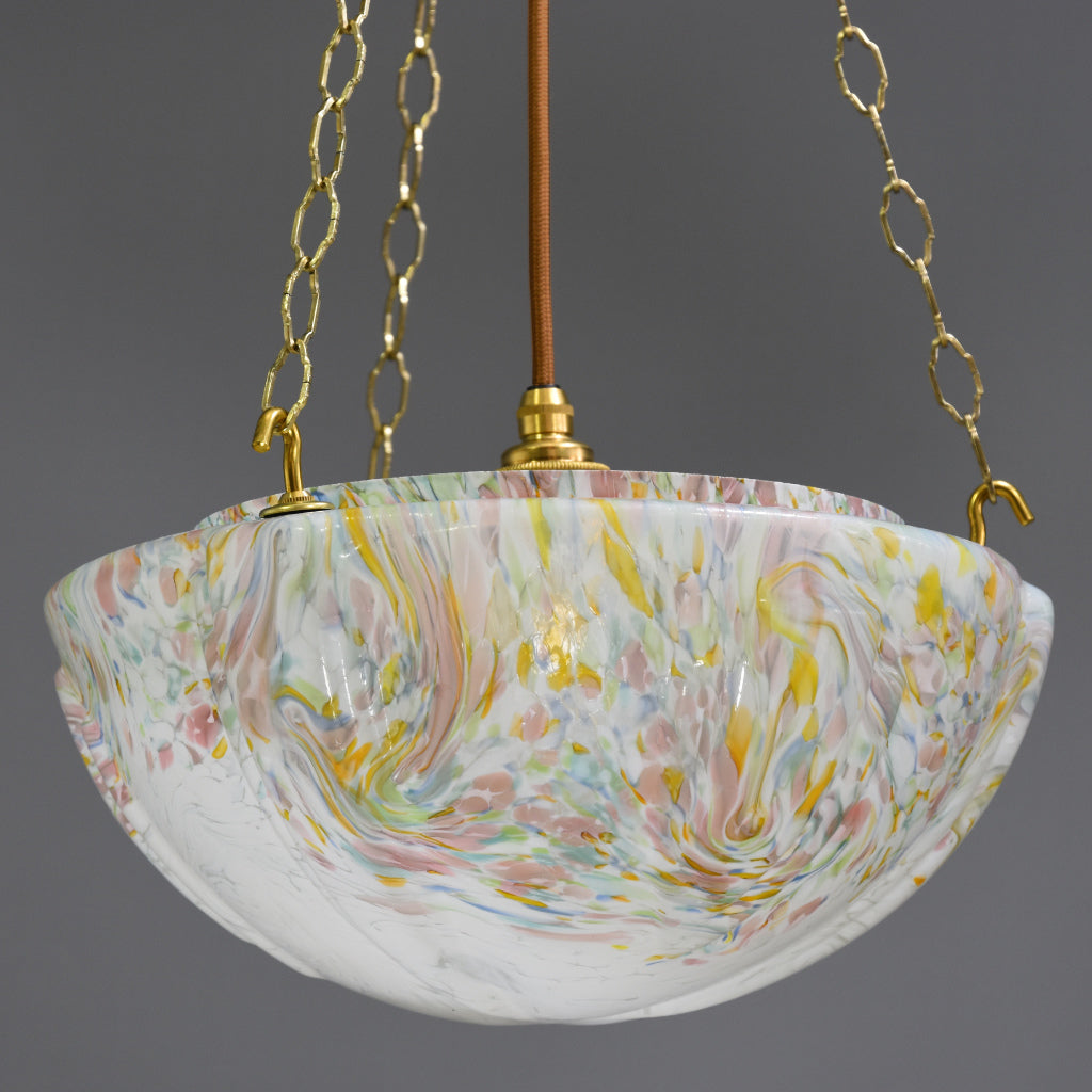 Original Art Deco flycatcher glass bowl ceiling light with superb multi-colour marbled design and period brass fittings