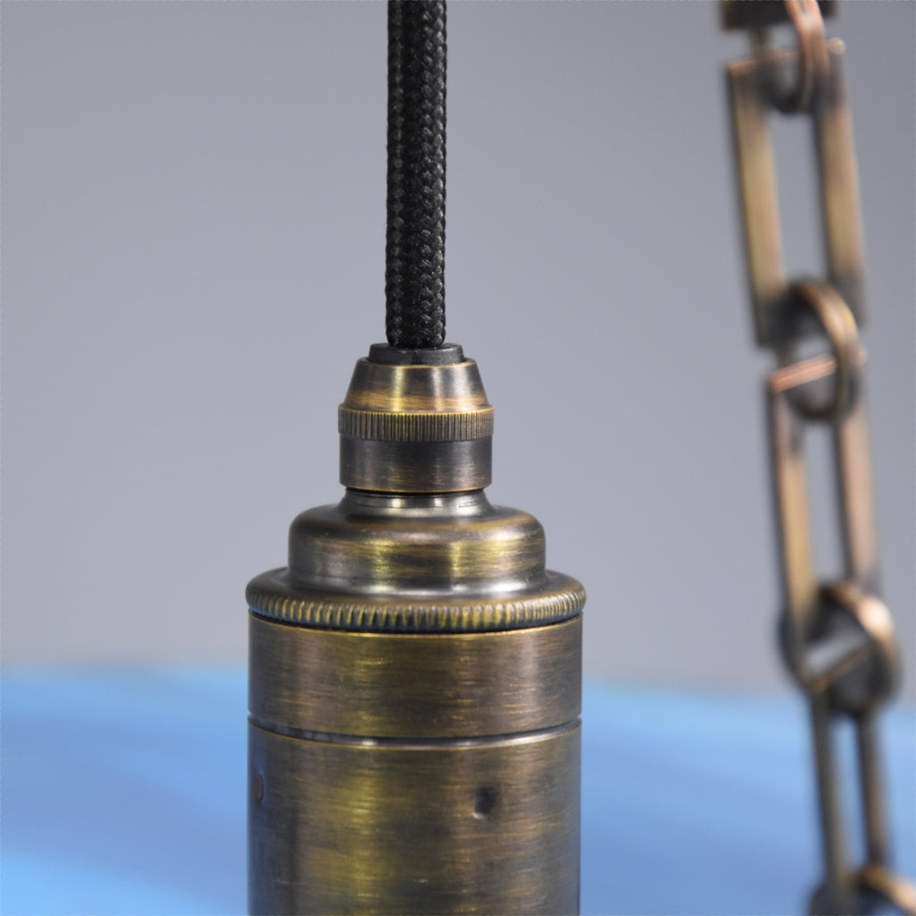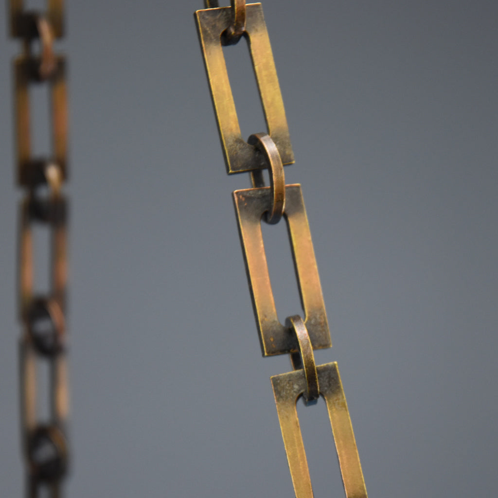 I have carefully restored this salvaged light to its former glory and fitted it with new brushed antique brass 3-hook ceiling fitting and lamp holder. The beautiful art deco chains and bowl hooks are original. It has a new deep stacked wooden pattress and is fitted with black fabric flex. The ES (E27) lampholder has been PAT tested for safety.